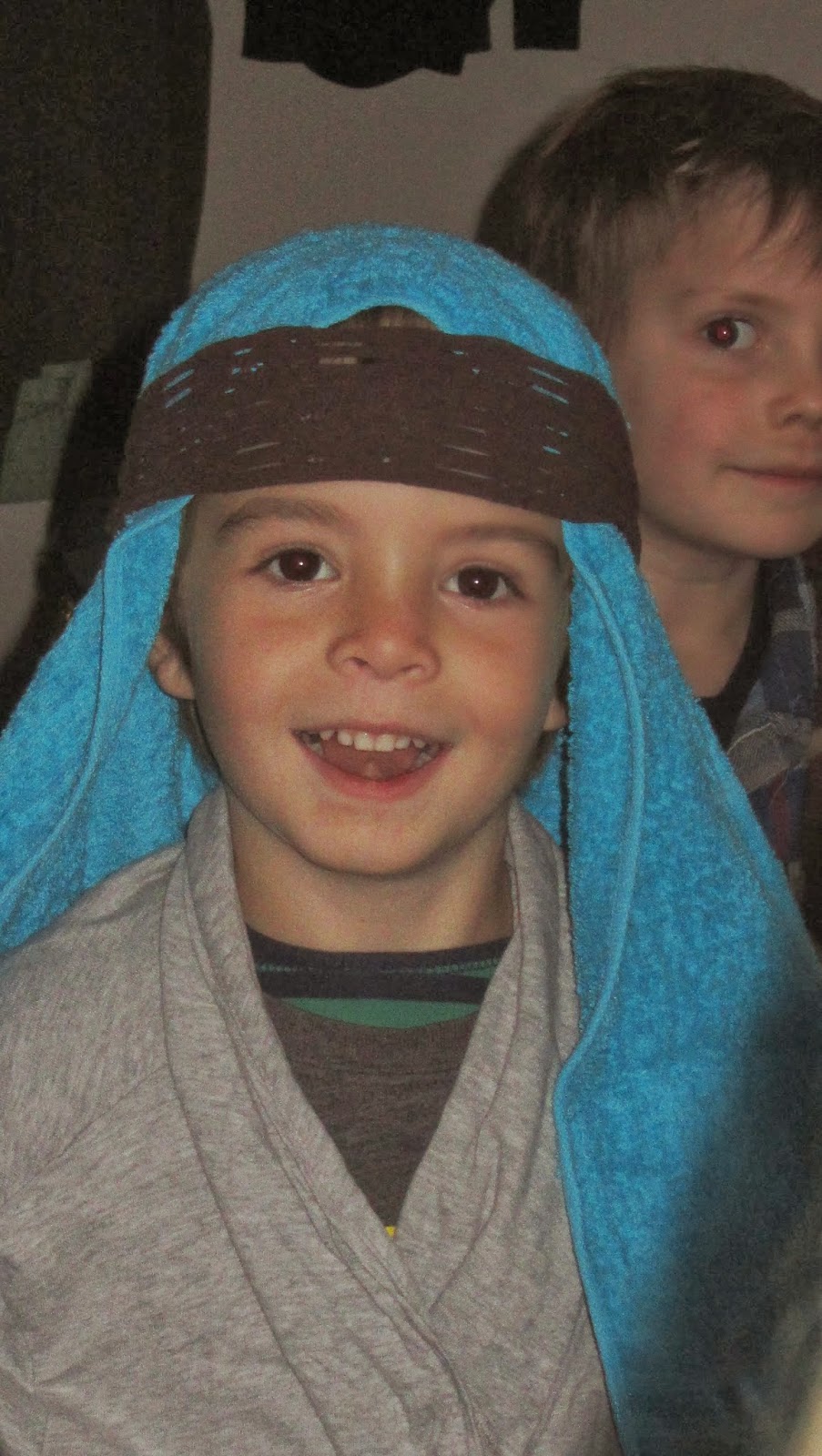 Both of the boys really wanted to be sheep for the church Christmas presentation, so I made these costumes for them. Given that I don't have a sewing machine or access to a lot of stuff here, I can't decide if I was a bit impressed at how they turned out or appalled at my level of insanity for deciding it was a project worth doing! They told people to come in costumes for the presentation at church. My kids and one other adult actually did. And they had costumes available to wear for it. Made me wish I had not decided to stay up well into the night, especially given that little man ended up barfing through the night and didn't get to go anyway! Seriously, someday I really will learn to re-calibrate my gauge on what is realistic to accomplish (and still be sane)! Several times during Advent I was reminded that I don't need to perform and fill it all up with perfect activities or prove anything or make Christmas happen and that who I AM during Advent is a lot more important than what I DO. See the "Joseph" picture above that consisted of a towel, a headband, and my bathrobe? Same smile from the kiddo. I need constant reminders and am hopefully growing in this! I like projects. I love doing special things for and with my boys, but I don't want to get wrapped up in the doing and miss just being present in the moments!