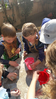 They came back inside to the "pavilion" where I had hidden a small toy lion. After finding it, they proceeded out to our yard (the Witch's "Castle") to free the animals I had frozen in ice.